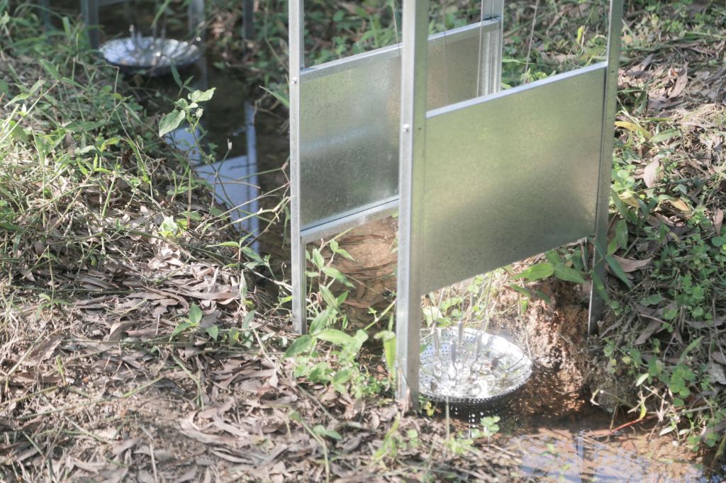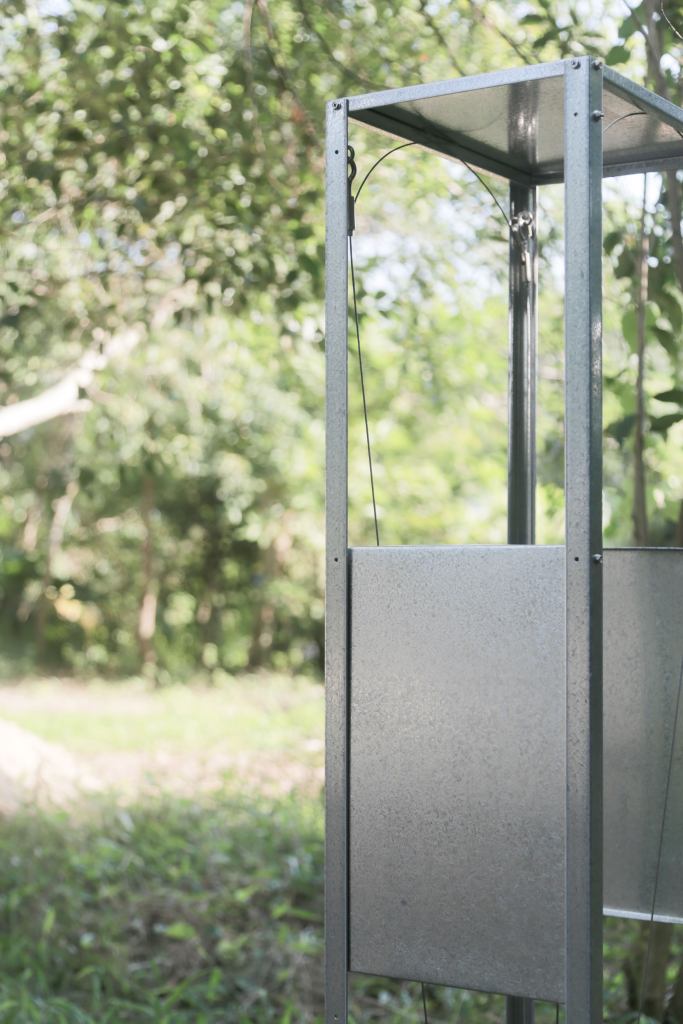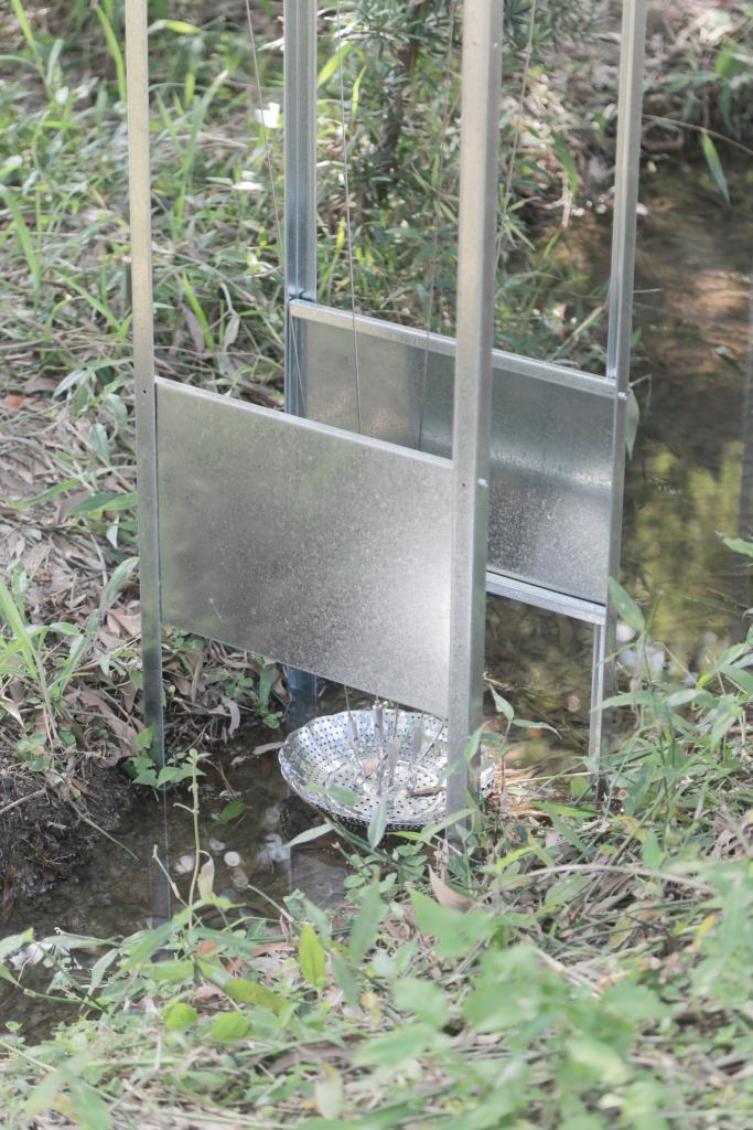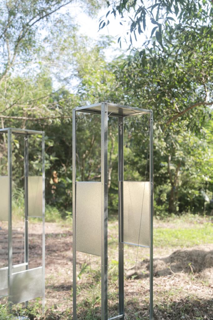 The stable, structural elements remain unaffected by external conditions, aside from the blurred visual reflections of the materials. Meanwhile, the unstable, inserted elements move in response to specific natural forces. As such, the installation’s expressive form can be interpreted as the mechanical rendered natural, or the natural rendered mechanical, as mass-produced copies, or singular appropriated works.